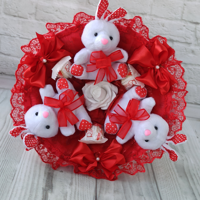 Червоний букет з м’яких зайчиків та цукерок Raffaello — подарунок для дівчини на 14 лютого та 8 Березня, Кременчук