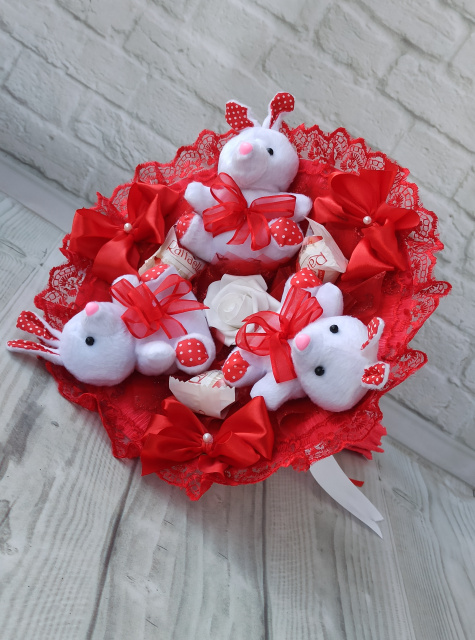 Червоний букет з м’яких зайчиків та цукерок Raffaello (Рафаелло) — це оригінальний, стильний та емоційний подарунок, який стане чудовою альтернативою класичним квітам.