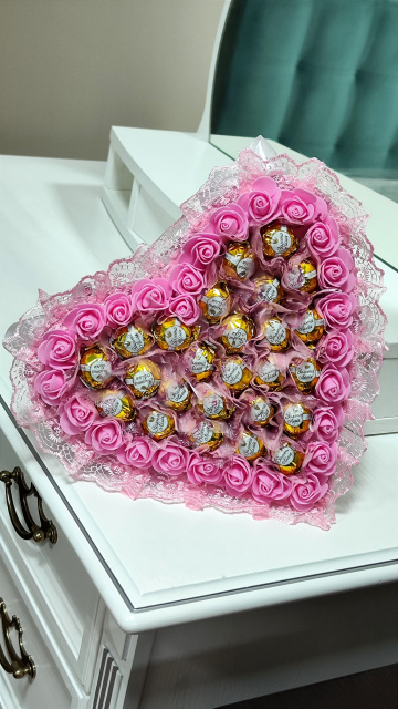 Солодкий букет у формі серця виглядає презентабельно, святково та дуже ефектно — чудовий вибір для тих, хто шукає нестандартний подарунок замість квітів.