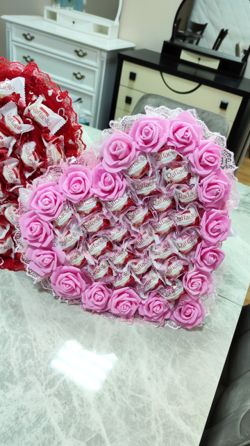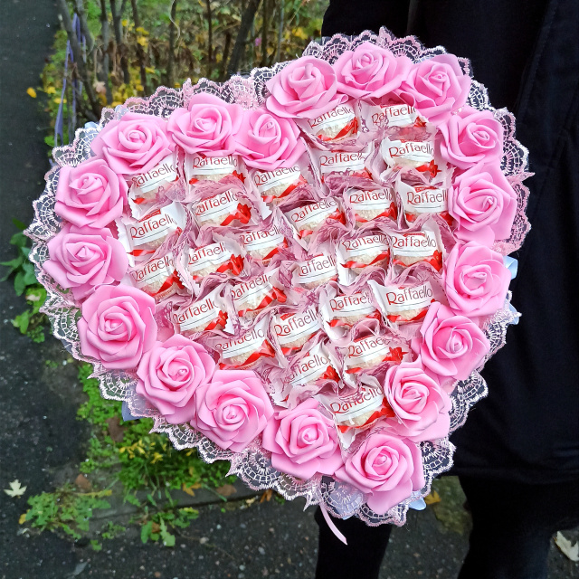 Великий рожевий букет із цукерок Raffaello у формі серця — розкішний солодкий подарунок для коханої дівчини або дружини на День закоханих, 14 лютого, 8 Березня чи іншу романтичну подію.
