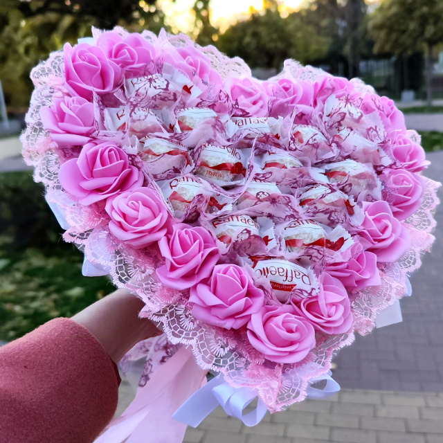 Розкішний рожевий букет із цукерками Rafaello, 27 шт подарунок для дівчини Рафаелло в формі серця, Кременчук