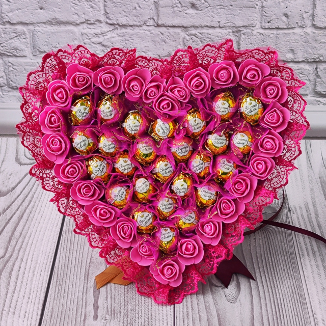 Малиновий солодкий букет з цукерок «Золота Лілія» у формі серця — розкішний солодкий подарунок для коханої дівчини або дружини на День закоханих, 14 лютого, 8 Березня чи іншу романтичну подію.