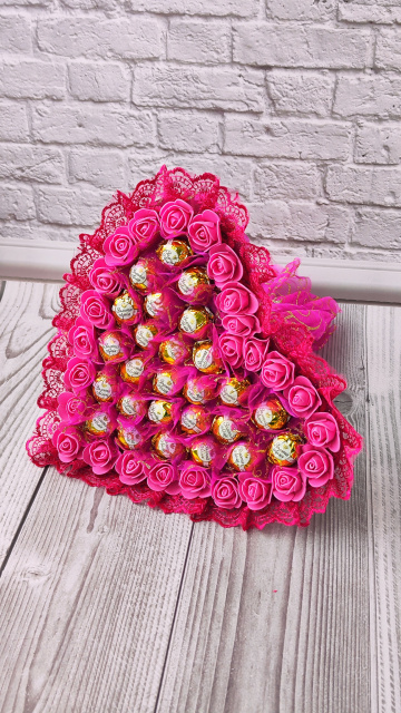 Солодкий букет у формі серця виглядає презентабельно, святково та дуже ефектно — чудовий вибір для тих, хто шукає нестандартний подарунок замість квітів.