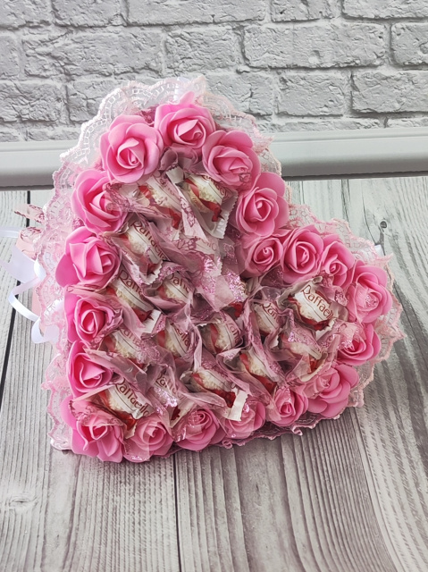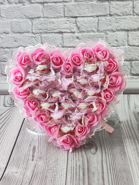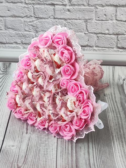 Рожевий букет із цукерок Raffaello у формі серця — розкішний солодкий подарунок для коханої дівчини або дружини на День закоханих, 14 лютого, 8 Березня чи іншу романтичну подію.