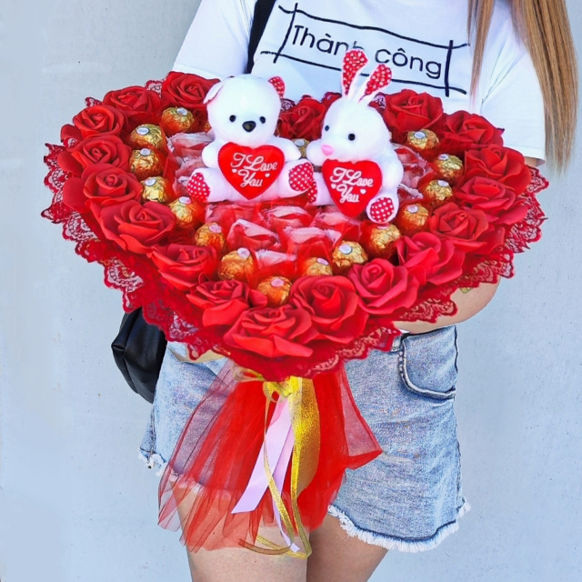Поєднання цукерок Raffaello та Ferrero Rocher з декоративними трояндами створює велику презентазібельну композицію, яка підкреслює почуття, увагу та турботу. Букет не в’яне, довго зберігає гарний вигляд і стане ідеальною альтернативою живим квітам.