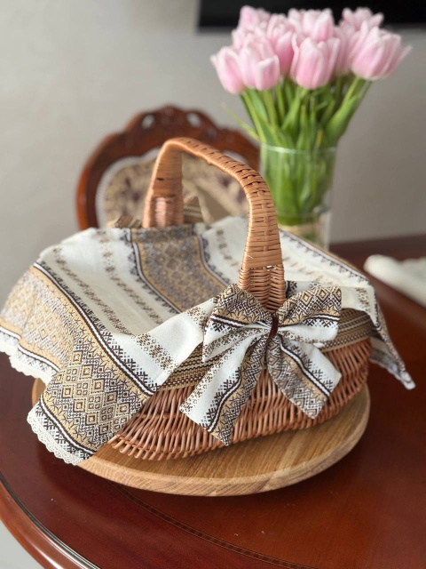 Світо-коричневий кошик на Пасху Голендер з полотенцем, бантиком та декором в етностилі з натуральної лози — ручна робота