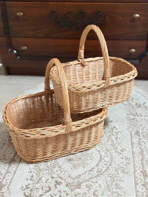 Великодній набір з натуральної лози — це поєднання українських традицій, естетики та практичності. Два кошики різного розміру ідеально підходять для освячення великодніх страв, святкового декору, зберігання продуктів або використання в побуті. Гармонійний комплект виглядає стильно та святково, а також зручно підходить для родини.